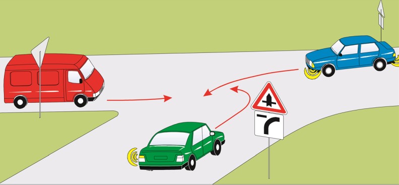 #1. Ktoré vozidlo prejde cez križovatku ako prvé?